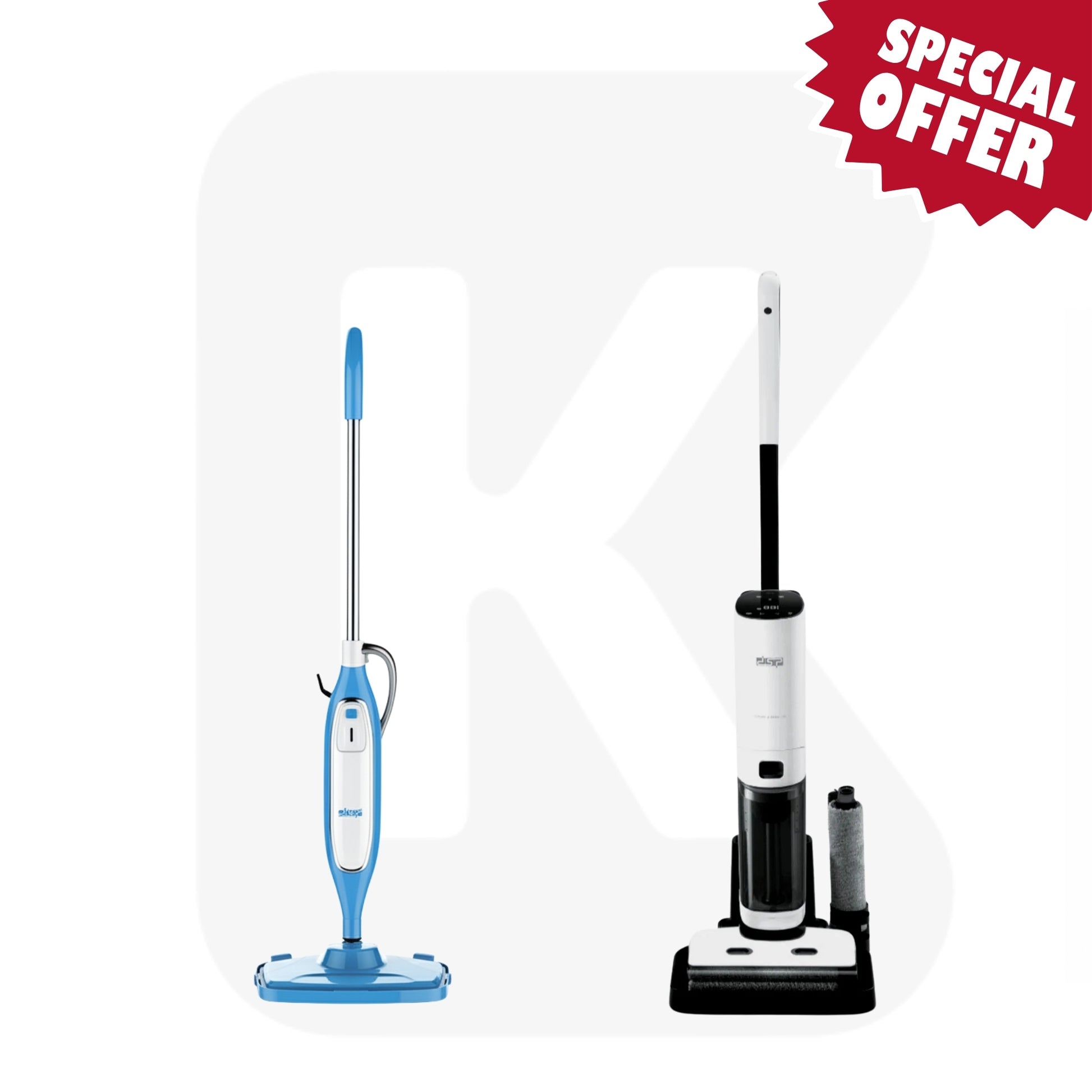 احصل على تجربة التنظيف المطلقة مع مكناستنا اللاسلكية 3 في 1 ومكنسة البخار 12 في 1. استمتع براحة المكنسة القوية الممزوجة بفوائد التنظيف العميق لمكنسة البخار - مثالية لمنزل نظيف تمامًا، كل ذلك مع عرض خاص واحد!